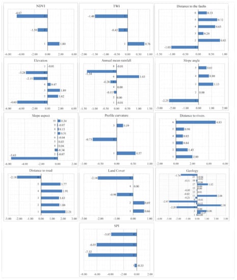 where is the number of pixels showing the presence of geohazards and conditioning factors; is the presence of geohazards and absence of conditioning factors; is the absence of geohazards and the presence of conditioning factors; is the absence of both geohazards and conditioning factors. The final weight was estimated using the following equation: