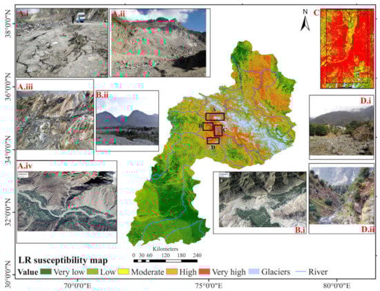 Comparison of ground truth data and field observation with Logistic Regression model results. (A) Overview of Hunza valley: (A.i) ground subsidence and shallow landslides, (A.ii) Attabad–Hunza, (A.iii) undercutting of slopes, (A.iv) aerial view of Hunza valley. (B) Gilgit section: (B.i) aerial view (Google earth imagery), (B.ii) debris fan. (C) Nanga Parbat Haramosh massif (western syntaxes), and (D) Dasu section.