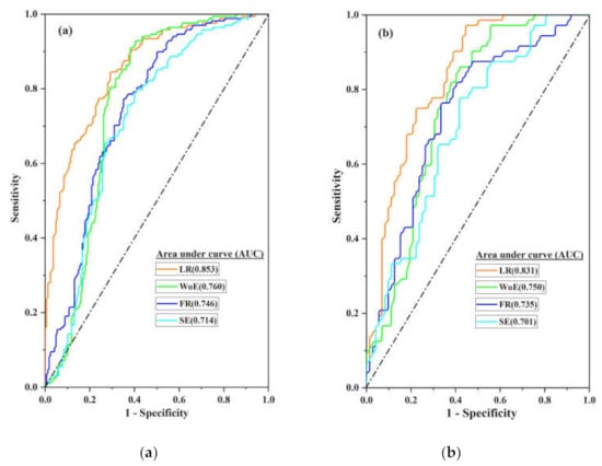 The AUROC curve was used for validating the obtained results. Success and prediction rate curves were plotted to compare the results of GHSMs for existing hazard sites. The performance of the models was evaluated by plotting AUROC curves for success rate (Figure 9a). The LR, WoE, FR, and SE models showed AUROC values of 85.30%, 76.00%, 74.60%, and 71.40%, respectively (Figure 9a). In terms of prediction rate, the AUROC values of LR, WoE, FR, and SE were 83.10%, 75.00%, 73.50%, and 70.10%, respectively (Figure 9b). The findings revealed that the GHSM prepared using the LR model had better predictive capability than those from the other three models. Other studies have also reported that the LR model has higher performance and is more suitable for susceptibility analysis compared to FR and WoE [68,70]. Our findings are in line with those of Rasyid et al. [70] in that a standalone LR model has high precision and is appropriate for hazard susceptibility assessment. Moreover, Polykretis and Chalkias [68] carried out landslide susceptibility by comparing WoE, LR, and ANN models and found that success and predication rate of LR model performed better (LR = 0.928 and 0.836, ANN = 0.912 and 0.780, WoE = 0.893 and 0.847). In another study, Benchelha et al. [91] found that the success and predication rate of LR is higher (91.8% and 91.1%) than ANN model (88.6% and 87.7%). Therefore, it is concluded that the LR model is the best option for mapping hazard potential under similar settings.