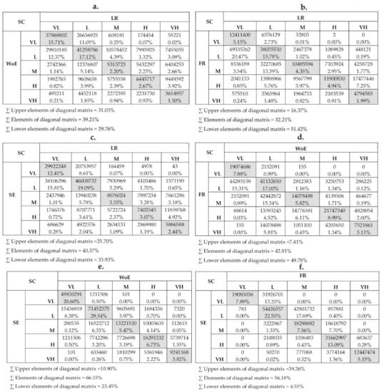 Comparison of susceptibility maps using a two-dimensional multiplication matrix: (a) LR vs. WoE, (b) LR vs. FR, (c) LR vs. SE, (d) WoE vs. FR, (e) WoE vs. SE, and (f) FR vs. SE. VL: very low, L: low, M: moderate, H: high, and VH: very high.