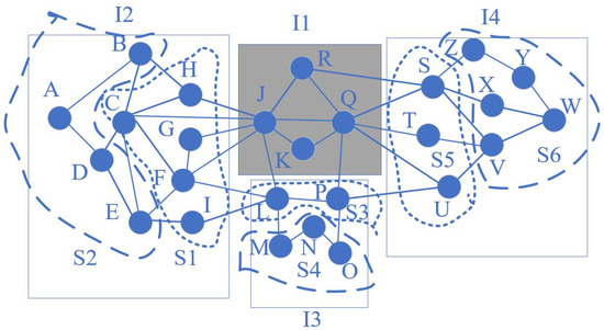 An example of spatial grouping result for an evacuation network. The dotted lines indicate the isolated networks that are directly influenced by the fire in I1 (in gray); the dashed lines indicate the isolated networks that will be potentially influenced by the fire in I1 (in gray).