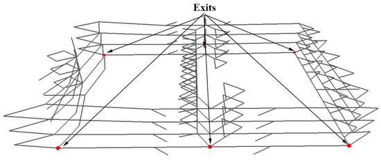 First, we establish the two test buildings’ graphs by applying middle axis extraction and key node extraction to the doors, corners, and stairs. Next, we set the fire sources with the following settings: we place the fire source at one node at a time and traverse the entire navigation network after all simulations, and the initial phase for the fire emergency is phase 2. In this phase, the accessibility of the neighbor nodes within a specific range of the fire source is disabled. We set this scope with parameters defined in the SFPE handbook [30] under normal fire spreading conditions: the fire-affected areas increase with a speed of 0.0015 m/s for 280 s and with a developing rate of 0.30 m/s for 140 s. The exit nodes for the MLC building are nodes 1111, 111,122, 111,164, 111,155, and 111,158. The exit nodes for the HUUC building are nodes 15, 16, 22, 25, 26, and 37.