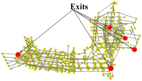 We generate the attribute values of the experimental buildings in Table 3 and the classical values according to the existing methods (we describe these methods in detail across Duan’s and Porta’s studies [19,24]). The first two lines of this table illustrate networks with comparatively low ratios between nodes and edges. The gamma index shows that these two networks have smaller numbers of edges than a fully connected system based on the same number of nodes. The transitivity values of these two networks are quite different. The value is over 0.2 for the HUUC building, but for the MLC building, the amount is quite small (less than 0.0041). This transitivity value difference means that the former building can connect the neighbor nodes more than the latter building. The average path length () describes that there are less than ten nodes for the ordinary path across the entire network for the HUUC building, and this means that its is short; this value for the MLC building is over 20 nodes, which means that its is long. The graph diameter here depicts the longest path distance covering more than 200 nodes, and it is a significantly large value for the MLC building. The local connectivity () for the HUUC building is approximately 0.8, and for the MLC building, it is approximately 0.7; both of these values are less than 1. These local connectivity values mean that the average influence of removing a single node is minimal. In other words, removing any node may not affect the primary network structure. Interestingly, the above features generated by the traditional network analysis method counter common sense for navigation analysis purposes. Although building exits’ spatial distribution significantly affects evacuation efficiency, many traditional network features ignore this phenomenon, whereas our proposed method reflects this exit neighboring phenomenon.