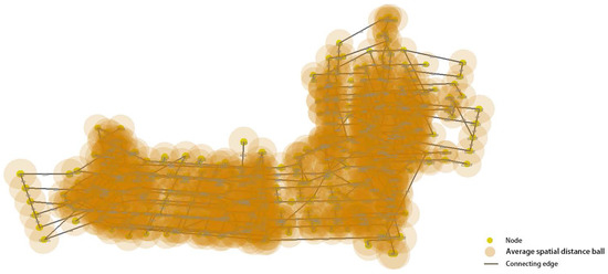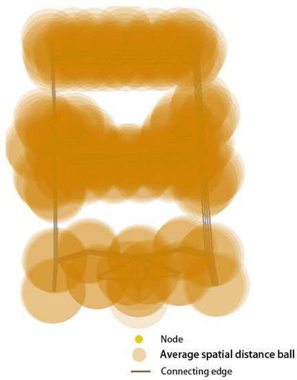Equation (4) generates a quantitative index Q for illustrating the spatial closeness of neighboring nodes in the navigation network, and two steps accomplish the computation of this index computation. The first step computes the number of nodes spread in the spatial scope around the considered node v. In detail, this scope is a 3D ball formed by using the 3D coordinates of v as the center and the value generated by Equation (3) as the radius . In other words, there are the nodes with spatial distances smaller than , where w represents any neighboring node of the current considered node v. After setting up covering balls, we generate an adjacent set of that contains every ball’s covering nodes. Then, in the second step, we calculate the arithmetic mean Q for the entire navigation network with the previously defined values for all nodes by dividing this sum by the total node number n.