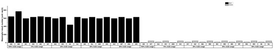 Table 4 summarizes the results from the studied buildings’ calculation using the proposed indices. We provide bar plots for the numbers of valid paths in the experiment buildings () (Figure 9), and we observe that this number is significant for the MLC building—over 600 under most circumstances. The meaningful result values for the HUUC building are slightly small because fire events can significantly hinder the indoor navigation network’s overall connectivity status compared to that of the MLC building under the same spatial setting. In Figure 10, the values between nodes and exits for various tests are quite different. Under most circumstances, the typical s are below 10 m for both buildings; however, this is not the case for the classical evacuation path generation. For both structures, the traditional process of searching through all nodes generates comparatively large s, and this situation also appears in the row “spatial sorted/node path/first percentage search” of Table 4. We can attribute the former case to the ignorance of the spatial weights in the path generation process. This ignorance leads to a significant increase in the of the MLC building to approximately 40 m and a similar increase of around 10 m in the HUUC building. We can explain the latter increase by the ignorance of the spatial weights during the pathfinding process when we only consider node distances; the choice of a smaller number of nodes along the egress path that crosses the fire disaster regions thus leads to a significant increase in the spatial weights along the generated egress path. We can explain that this situation does not appear for other settings of the node usage percentage as follows: the 20%, 50%, and 80% settings in the fourth column of Table 3 are sufficiently large to allow the pathfinding process to take comparatively safe and short node paths to egress; thus, the pathfinding process cannot receive prominent benefits by increasing the searching scope.