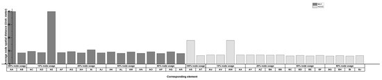 Let us first define a result count that originates from calculating the meaningful evacuation paths passing a specific node marked with the label t. Therefore, the meaningful result counts, , equals the sum of elements neither in the zero nor null set () that either cover the case of the considered node as the evacuation target or the case in which there is no accessible, safe evacuation path to the target node. Moreover, these values mostly come from a test that cannot generate any meaningful evacuation path or exceeds each path generation process’s time threshold.