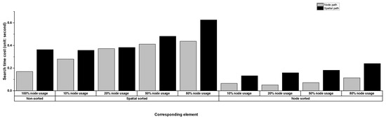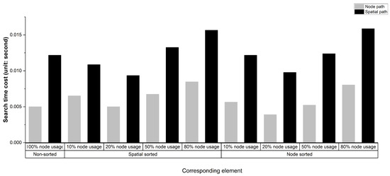 For the spatial sorting of nodes, we arrange the sequence of nodes by a specific standard, such as the node distance to the fire region, and we fetch only the nodes relevant to the pathfinding process. For this purpose, we utilize the first 20% of the sorted nodes for evacuation path generation according to the Pareto principle [29]. Additionally, we introduce the 10%, 50%, and 80% cases of all nodes as the comparison group. The purpose of using a different number of nodes during navigation is to balance the volume of node data and the accuracy of the generated evacuation paths. When the number of nodes is extensive, using all nodes in the evacuation path generation is not optimal for saving time. Using the necessary number of nodes for the required computation is a wiser option. To this end, we can only select the exact number of nodes by fully understanding which of the nodes are crucial during evacuation path generation operations.