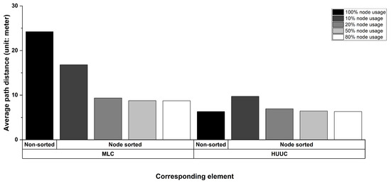 The average length of path finding is the average value (generated by subdividing the path node number ) of the generated path distance for each successfully generated path p in the complete path search set P. This value is introduced to reflect the effect of applying different optimization principles for our solution. For each path , , I is the number of nodes along path p, and we use two distance types: the node distance and spatial distance; thus, the following two subsections describe these two distances for the average length of a path in detail.