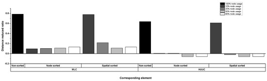 In Figure 13, the s of the methods considering the different percentages of nodes used are almost the same as expected: the usage of the node sorting method significantly reduces the average spatial distance for the generated path. Only one exception appears: the non-sorted classical result for the HUUC building is shorter than the result obtained with the first percentage setting. This exception can attribute to the limited number of nodes in this building. Therefore, when a fire spreads, only a few nodes are available for pathfinding. The number of possible egress paths is limited; thus, classical methods that only consider node paths can still generate a spatial distance-optimized result. Figure 14 shows the reduction ratio of the path result distance between the generated node-centered path and the spatial-centered path. We observe that the reduction ratio is small across all the HUUC building results, except the classical method and the first percentage setting considering the node sorting process’s spatial weights. We can explain this exception by the small number of nodes in the HUUC building; thus, the pathfinding program produces the spatial weight-centered path without considering the spatial weight element. However, the reduction ratio case for the MLC building is different: the reduction ratios for all situations are easily perceived. The reduction ratio is significant when the spatial path distance generated by nonspatial weight methods is also long, and this ratio is small when the is short.