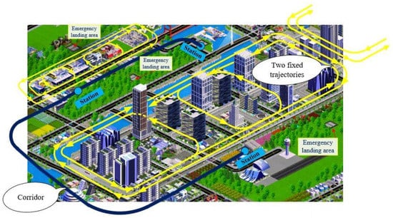 It seems that the most promising solutions for urban air transport management must use specially structured airspaces with predefined fixed routes or fixed corridors (Figure 1) following the Singapore recommendation and [,] demonstrations []. Here corridors mean multilane “highway” channel routes.