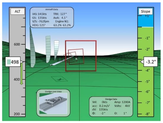 Figure 2 shows the developed cockpit tool to support the EU-supported so-called Gabriel concept (magnetic levitation assisted take-off and landing concept of an undercarriage-less aircraft []), the primary flight data, recommended flight tunnel, and side wing profiles being displayed.