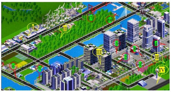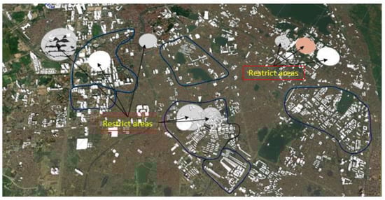 Today, the Global Positioning System (GPS) is the most widely used Global Navigation Satellite System (GNSS) worldwide. It provides continuous positioning and timing information globally, under any weather conditions, including constellations of satellites orbiting over the earth’s surface and continuously transmitting signals that enable users to determine their position. Therefore, many scientific reports presented the developed system combined with GPS/real-time kinematic positioning (RTK) to solve the autonomous flight problem, such as [,,]. The flight is fully autonomous, but the drone continuously estimates its position, possible conflict and adapts its motion to the real flight situation. The drones’ positioning is based on GPS combined with GIS mapping [,], using fixed-point markers in the infrastructure and active, intelligent surveillance (Figure 3). Here GIS supports the definition of optimal trajectories based on minimizing the habitants being affected by the environmental impact or endangered by the possible emergency/accident situations.