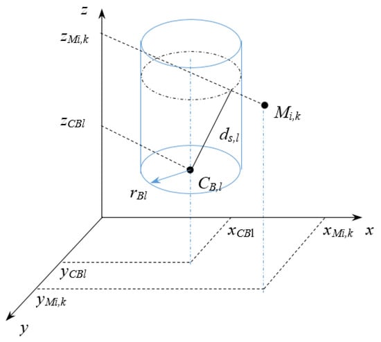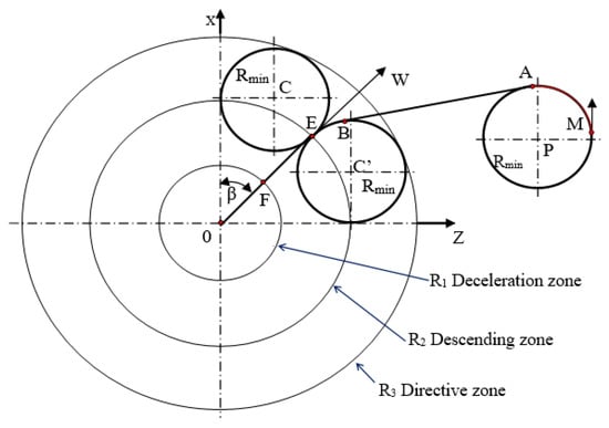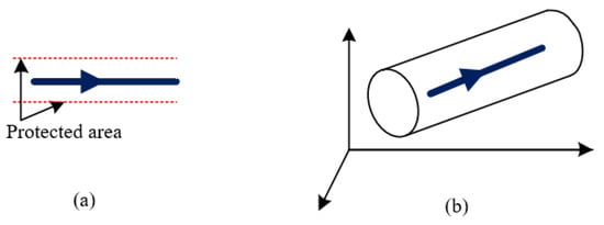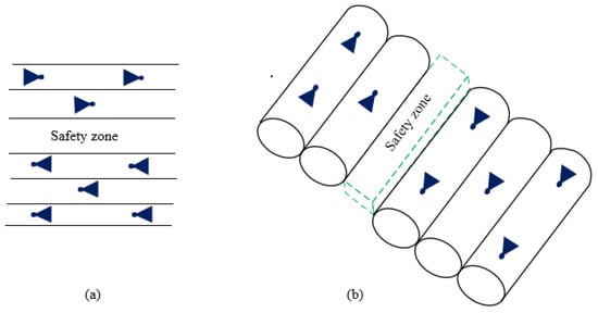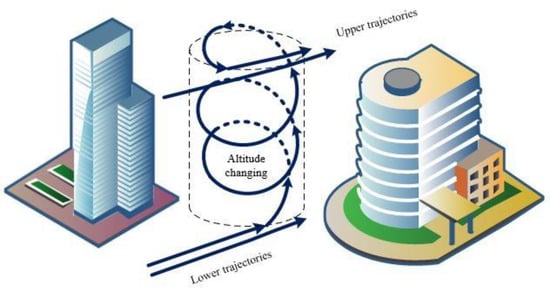 - Sectors for the vertical motion: vertical moving of drones, e.g., flying up (climbing) or down (descent), can be realized as lifting of copters or flying in a spiral for fixed-wing UAVs. Therefore, a particular cylinder will define the area for changes in height (see Figure 5).