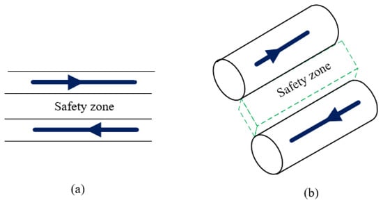 Drones fly by following a predefined trajectory or corridor (Figure 1). Each drone flies on its trajectory that might be part or follow the generally predefined trajectories with, for example, changing “lanes”, heading, altitude, or speed. Drones can never meet other drones and drones moving in the opposite directions on their trajectory.