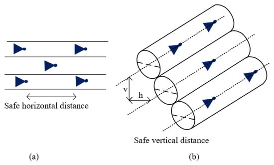 - The lateral separation (horizontal and vertical direction) is defined by Figures representing the recommended typical elements of airways. As a general rule, the horizontal and vertical distance between the drones’ center of gravity heading in the same direction should be equal to 5–8 times their maximum dimensions. If drones fly in the opposite direction, a particular safe distance equal to an empty lane should be applied.
