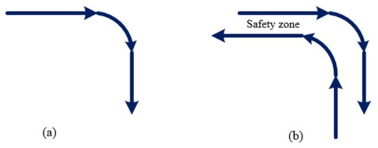 There are two different crossing options: (i) the straight-line crossing with no heading modification after the crossing (changing lane) (Figure 12a) and (ii) the crossing with heading modification, including possibly a vertical motion due to the modified heading (Figure 12b).