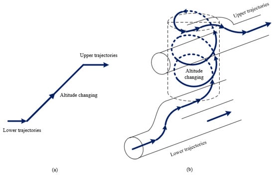 Changing heading at different altitude: 1—changing to a new lane, 2—flying in the new lane, 3—increasing/decreasing the altitude, 4—turning on the same altitude, 5—flying at the new lane in the desired heading, 6—merging in the lane at the same altitude and at the desired new heading.
