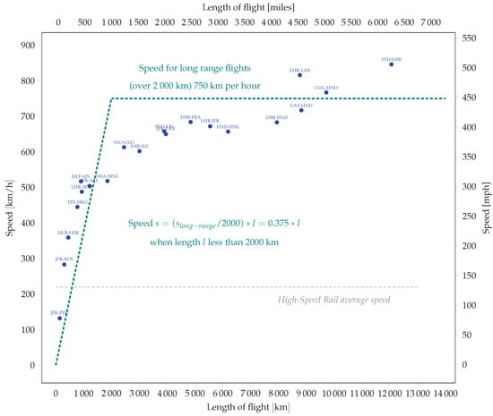 In order to account for the lower commercial speed of aircraft services on short distances, as introduced before [], we consider a cruise speed of 750 km per hour beyond 2000 km of range, and the following formula below 2000 km: