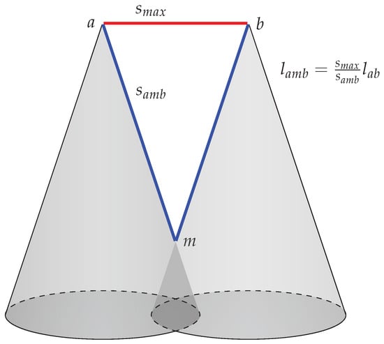 In Figure 3, two cities, a and b, are joined by a fast non-stop transport system (in red), and also joined by a slower terrestrial transport mode (in blue). The fast transport link is represented through a straight line of speed , while the cones represent the surface supporting the slower terrestrial transport mode of speed , with m as the midpoint between the two cities and the intersecting point of the two cones. Assuming that terrestrial travel speed are similar in all the geographic space considered, the slope of the cones centred on the two cities is a coherent representation of time-space. In Figure 3, the slope of the cones implies that the length of the straight red line, and the length of the blue line drawn on the cone and joining the two cities, are proportional to the respective travel times, according to a provided formula of a ratio of speed. This three-dimensional geometry forms a time-space representation with different transport speed.