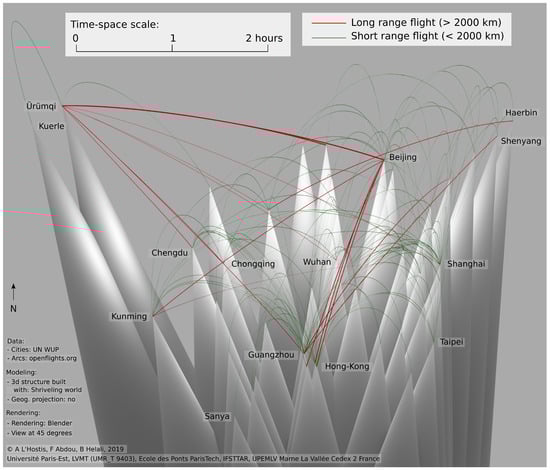 Tests, which can be seen at the blog https://timespace.hypotheses.org (accessed on 13 September 2018), shown that the shorter the list of cities, the easier it is to produce a readable representation. In this view, we used two criteria to operate the selection of cities. Only cities with more than a million inhabitants were considered. In addition, we chose only those cities served by aerial services in 2006. This selection rules applied to the UN cities database generated a list of 45 Chinese cities, including Taiwan.