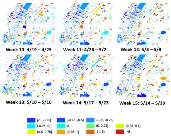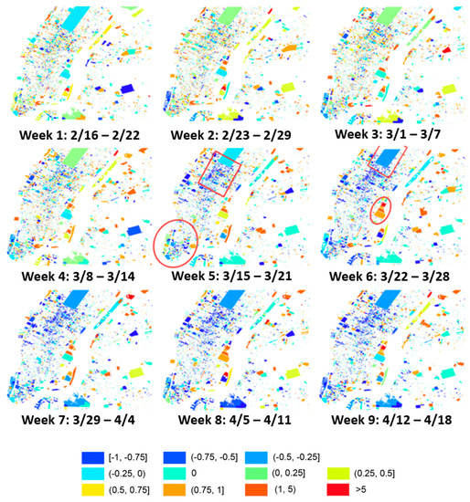 Figure 1 and Figure 2 show the human mobility patterns change detected using Twitter data at the parcel level. Figure 1 shows changes from week 1 to week 9, and Figure 2 shows changes from week 10 to week 15. From a spatial perspective, the decrease in the number of Twitter users can be observed as early as in the week of 15 March 2020 (hereafter 3/15, Week 5), which is the week before the city-wide executive order. From the Monday of week 5, most commercial and office buildings in Midtown Manhattan (dark blue polygons within the red rectangle in week 5) have seen more than a 75% decrease in the number of Twitter users compared to January. Such reduction indicates the spontaneous actions of work-from-home from many companies. Downtown Manhattan (red circle in the figure of week 5), including the Soho District, Wall Street, World Trade Center, and the ferry to Statue of Liberty, has always been a popular destination of tourism. As the World Trade Center and Statue of Liberty suspended their tourism-related activities on 3/14 and 3/16, the number of Twitter users decreased more than 50% at One World Trade Center and the Battery Park, which is where the ferry to the Statue of Liberty departs. After the stay-at-home executive order was placed on 3/22, the majority of non-residential buildings in Downtown Manhattan show more than a 75% reduction in the number of Twitter users. In addition, Central Park (red rectangle in the figure of week 6) had seen more than a 50% decrease in the number of Twitter users after the issue of the executive order, suggesting that the attraction of this largest park in New York City has been dampened during the pandemic. The weekly number of Twitter users in Central Park remained at a similar level until the end of May. Contrasting to the general decreasing trend, hospitals (red circle in the figure of week 6) saw a significant increase in the number of Twitter users since week 6 (3/22), when the number of COVID-19 cases in NYC started to rise [].