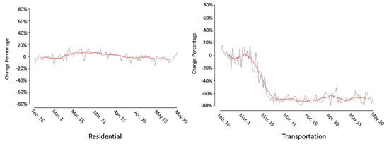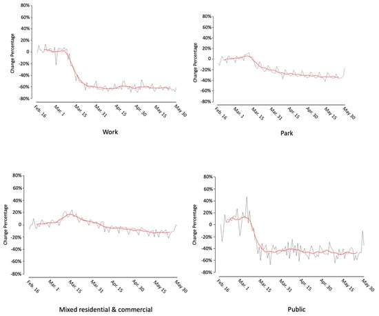 Figure 3 shows the daily change for the six land use types. The black line shows the original change pattern, and the red line is the smoothed trend with Gaussian smoothing.