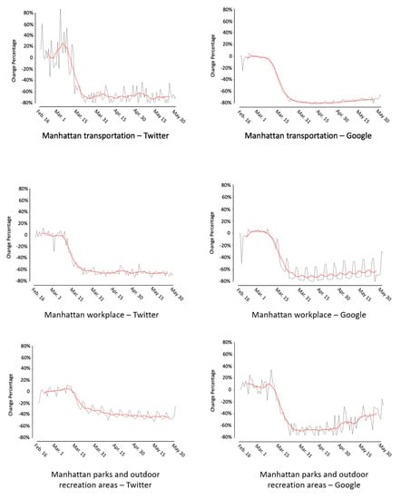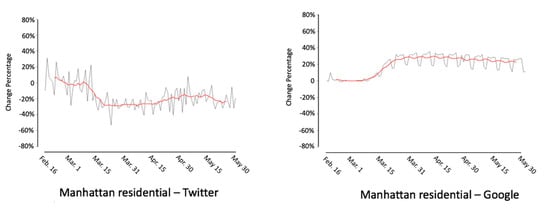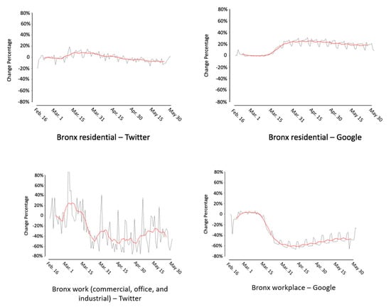 In Twitter-based human mobility pattern, the residential area shows no obvious increase, while Google shows a 20% increase in residential areas. As mentioned before, Google’s human mobility change for the residential area is based on time spent; therefore, a larger increase from Google is found. Both Twitter- and Google-based human mobility patterns find about a 60% decrease in the workplace in Bronx. However, the Twitter-based mobility pattern shows more dramatic day-to-day changes. Another major difference between these two trends is that Google shows notable weekday–weekend patterns.
