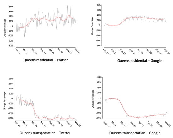 Twitter- and Google-based human mobility changing patterns in Queens County.