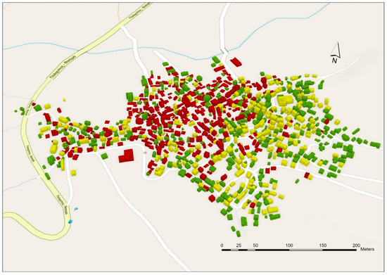 The traditional settlement of Vrisa, Lesvos, Greece, was severely damaged by the catastrophic earthquake of 12 June 2017. Up until today, more than 350 traditional buildings have been demolished due to their significant degree of damage and more than 200 buildings with moderate seismic damage have been repaired. The buildings of the settlement are mostly masonry buildings, single-story and two-story with tiled roofs (only nine buildings are three-story). Several buildings also have a basement and as a result, their heights range from 4.5 m (single-story with tiled roof) to 7.5 m (two-story with roof). Their three-dimensional modelling in Level of Detail 2 (LOD2) was performed using the digital surface model (DSM) and the orthophoto map that were created by processing high-resolution images captured by UAS. The LOD2 buildings were generated in a part of the Vrisa settlement consisting of 80 buildings using the footprints of the buildings, digital surface models (DSMs), a digital elevation model (DEM) and orthophoto maps of the area (Figure 1) [49,50]. On 7 October 2020, high-resolution images of the entire settlement of Vrisa were collected for the creation of 3D points clouds and then were utilized in the 3D modelling of the settlement at LOD2. The integration of seismic damage in LOD2 models was based on the categorization of Earthquake Planning and Protection Organization (EPPO) [51] in three classes, “green—safe for use”, “yellow—unsafe for use” and “red—dangerous for use”, as shown in Figure 1.