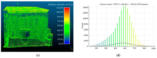 The results obtained from this process were 3D point clouds of the two buildings. Specifically, the point cloud of building A consists of 296522 points and building B consists of 142801 points. The density is estimated by counting for each point the number of neighbors N (inside a sphere of radius R). In our case, the surface density of point clouds for both buildings presents a normalized distribution. As shown in Figure 3b, the majority of building A points have a range of neighbors 1300–1900 (R = 0.1 m, mean = 1595) and the standard deviation is 249.89. For building B, most points have a range of neighbors 500–700 (R = 0.1 m, mean = 559) and the standard deviation is 145.47 (Figure 3d). Finally, in some smaller parts of the buildings, there are gaps in the areas which could not be covered by images (i.e., under the roofs, cornices and adjoining buildings).
