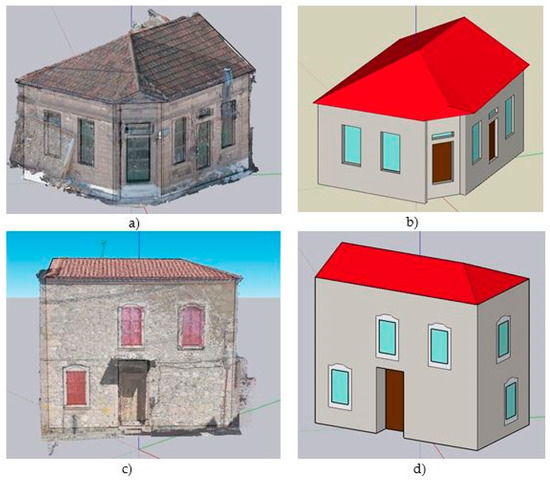 Subsequently, 3D modelling of the buildings was executed through Trimble SketchUp Pro by a drawing approach from 3D point clouds. More analytically, a drawing approach of the boundaries of the point clouds was selected, starting from the ground surface to roof surface. Three-dimensional modelling in LOD3 for buildings depends on various factors such as user experience, cloud density and building complexity (number of windows, doors, etc.). In particular, for building A, the roof was more complicated and needed more time to be modelled compared to the other parts of the building. Furthermore, the building consisted of five walls, four windows and two doors that required considerable time for modelling. The geometry of building B was regular; however, it consisted of 4 walls, 10 windows and 1 door. Hence, the same time was required for each building to be modelled (approximately 1 h). The point clouds obtained through UAS present a difficulty regarding the 3D design, as in some places there are gaps, bumps or they are sparser compared to the available TLS. Another issue worth noting is that it is difficult to design a building that has suffered severe damage (collapse of roof, walls, etc.) in 3D.