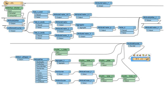 For the first approach, the FME by Safe Software [54] was used for the transformation of SketchUp models into the CityGML format. Thematic models prepared in SketchUp were exported in “.3ds” format to be processed in FME Workbench (Figure 5). FME Desktop 2021 supports several formats for interoperability, data conversion, transformation, integration and validation. Firstly, a SketchUp Reader was implemented for the CityGML LOD3 transformation. Subsequently, a “transformer” was used to restore the SketchUp layers and extract them based on the different layers by trait “SketchUp _layer_name”. Several transformers were used to perform some processes, such as converting a list of values into an FME list attribute, performing quality testing on data, creating new features and assigning unique IDs to generated features. Furthermore, the different categories of buildings that were separated were WallSurface, RoofSurface, GroundSurface, Door and Window. Afterwards, “lodMultiSurface”, “CityGMLGeometryType” and “CityGMLRole” were set. Finally, the CityGML LOD3 models for the buildings were obtained.