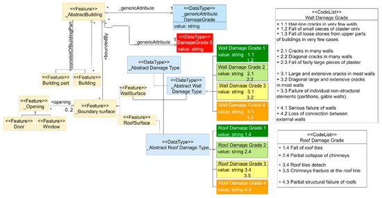 To enable the semantic enrichment of the CityGML models with the seismic damage suffered by the individual parts of the buildings, the ontology of seismic damage grades was created based on EMS-98 for masonry buildings. More specifically, this ontology includes the following categories of damage in the main parts of the building, which are the walls and the roof (Figure 6):