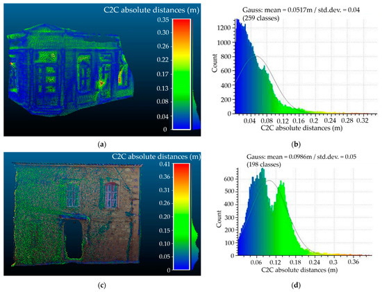 Cloud-to-cloud distance method results: (a) mean distance is 5 cm for building A, (b) histogram of the results (standard deviation = 0.04), (c) mean distance is 9 cm for building B, (d) histogram of the results (standard deviation = 0.05).