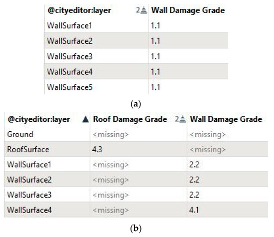 The next step is the enrichment of the attributes for each GroupType and this was executed with the CityEditor tools for displaying, editing, adding and deleting attributes. The attributes are subdivided into the categories Standard (CityGML-specific attributes) and Generic (generic attributes of various data types). Firstly, the standard attributes (model name, roof type, class, measure height and usage) were added. The usage of buildings A and B was ¨Café¨ and ¨Property¨, respectively. Both roof types consisted of ceramic roof tiles. Secondly, in the category of generic attributes, new fields were created for the semantic enrichment of the building’s seismic damage. At this stage, attribute fields named “Damage Grade” for the entire building, “Wall Damage Grade” for the walls and “Roof Damage Grade” for the roofs were created and the values were imported. The seismic damage was visually inspected from the point clouds of each building and the damage grades related to each building’s walls and roof were added according to EMS-98. In more detail, the damage of the buildings is reflected in 3D point clouds. The clouds present gaps which, depending on their size, refer to small or large detachments/collapses in parts of the masonry or the roof, while the existence of gaps with a linear arrangement, e.g., cracks, is due to cracks in the walls. Subsequently, for building A, all walls have cracks; thus, each wall was characterized with grade 1.1. (hair-line cracks in walls). Building B, as inspected from the point cloud, has a serious failure in the west wall, so “WallSurface 4” was characterized with grade 4.1. The rest of the walls have diagonal cracks; thus, each wall was characterized with grade 2.2. Additionally, the roof of building B was characterized with grade 4.3 (partial structural failure of roofs). Furthermore, building A was grouped in its entirety and characterized with Grade 1 (negligible to slight damage), while building B was characterized with Grade 4 (very heavy damage). The final models were exported in CityGML.