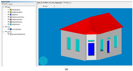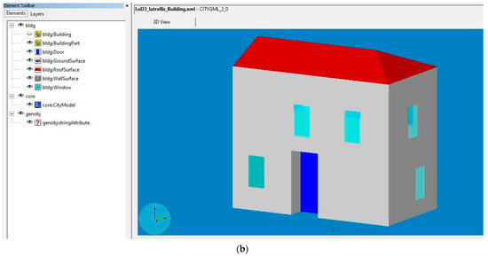 Over the past few years, 3D representation of spatial objects from buildings to whole cities has become increasingly important for a better understanding of the modern world. Three-dimensional models are digital objects that represent urban spatial data of the Earth’s surface [1]. There has been a wide development in the usage of 3D models and 3D geovisualization in a variety of applications such as navigation, urban planning, energy planning, landscape planning, 3D cadastre, real estate, public participation, construction, tourism, facilities management, environmental simulations, Smart Cities applications and disaster management [2,3,4]. Three-dimensional models had the disadvantage that they only serve as graphical or geometrical models ignoring semantics and topology. These models could only be used for visualization purposes, but not for thematic queries, analysis tasks, and spatial data mining [5]. In semantic 3D modelling, besides the topology and geometry, the semantics of 3D objects are established, and thus, the objects of the urban landscape are classified and their spatial and thematic properties are described. The semantics are important for the structural complexity of urban objects. City objects can be semantically enriched and divided into their structural components with their attributes and their correlations [6]. Based on these, CityGML has been developed. CityGML is an international standard created by the Open Geospatial Consortium (OGC) and it is based on XML format for the storage, representation and exchange of 3D models [5,7,8,9]. In CityGML, standard, semantic, spatial and geometrical properties of building models are organized in five levels of detail (LOD), from LOD0 to LOD4, where models become increasingly accurate and detailed [7]. Analytically, a building in LOD0 is represented by 2.5D footprints. LOD1 is a generalized block model with walls, without any roof structures. LOD2 is a model with walls and various types of roof structure. LOD3 is a detailed model with openings (windows and doors) and different roof structures. Finally, LOD4 is a LOD3 model that includes detailed indoor geometries [9,10,11].