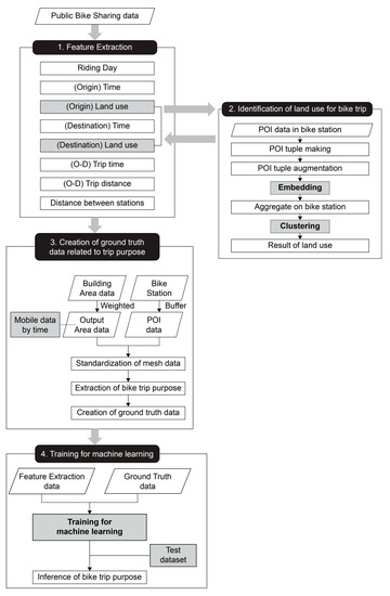 We developed a method for inferring the purpose of public bike trips based on bike-share data and POI data. The method involves extracting the features that affect the trip purpose from the data and using them for machine learning to infer the final trip purpose. When selecting the utilized features, the land use information at the bike trip starting and end points were determined by embedding and clustering the POI data for the area around the bike station. In addition, to establish the ground truth data for determining the trip purpose, we standardized the mobility data for each time period in a mesh form and extracted it together with the POI data. The overall method is illustrated in Figure 1.