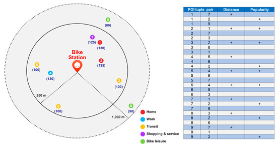 Based on the method suggested by Yan et al. [24], the proposed POI type embedding method for bike trip purpose inference is as follows. First, a tuple is formed for POIs located within a radius of 250 m of the bike station (1000 m in the case of the POIs related to bike leisure). The created tuple is augmented using an augmenting factor β that considers the popularity and distance between the POIs. Figure 3 shows the configuration of all the tuples around the bike stations and their augmentation. As indicated in the table on the right of Figure 3, if k is 3 during the configuration of the k-nearest function, the tuples would be formed by grouping the set of three POIs closest to each POI, and all POIs in the bike station would be included. In this case, because the distance between tuples is shorter and there is an increase in the number of rentals, the augmentation can be performed using factor β, as suggested by Yan et al. [24]. The numbers in parentheses below the POIs in Figure 3 are the values obtained by distributing the total number of bike rentals (assumed to be 1000 times here) among the POIs proportional to their respective distances from the station. This indicates that the POIs closer to the bike stations are more popular. In addition, because the number of rentals varies between bike stations (for example, the number of bicycle rentals at stop A may be 1000, whereas that at stop B may be 50), this method can be applied differently among the stations. The tuples created in this way were trained using TensorFlow, with the number of embedding dimensions set to 70 and applied as in previous studies.