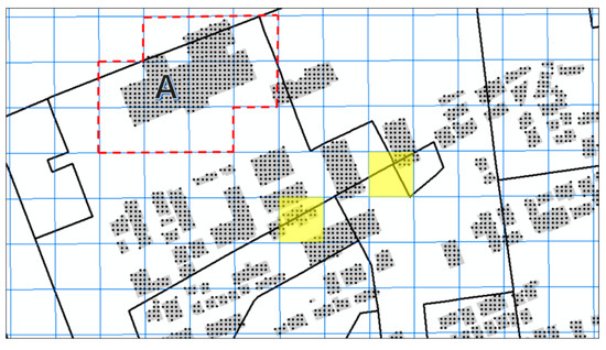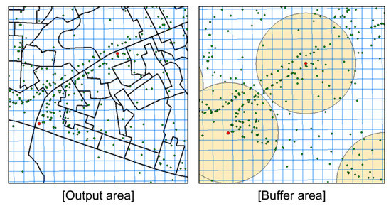 To standardize the output area unit into mesh data, the mesh weights were determined using the building floor area data. These data were used to consider the area where the actual population lives in the geospatial space. In Figure 5, the mesh data (standardized unit), building floor area data, and output area data are presented in the same space. First, the points were arranged at intervals of 5 m in the building polygon, and the building floor area was then equally divided at each point to obtain their attribute values. For example, building A, which is represented in Figure 5, has a building floor area of 1000; if the number of points is 100, each point would weigh 10. If this value is distributed in a mesh, each grid surrounding building A (marked by red dashed lines) would have a different weight. The next step is the determination of the output areas to which the numbered mesh points belong. This step is used to match a mesh area and an output area based on points.