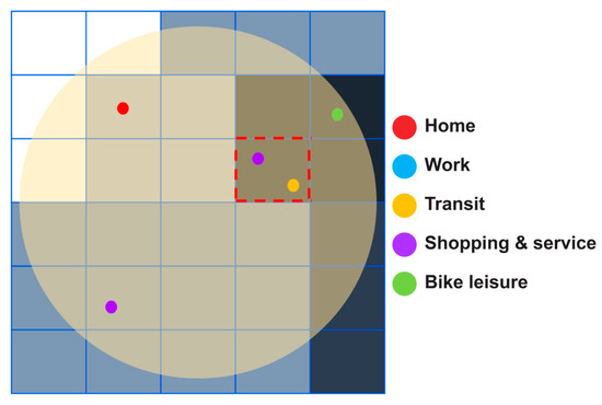 The method for inferring the bike trip purpose using mobile data standardized in mesh units and POI data around the bike stations is as follows. First, the 250 m-radius buffer zone of the bike station is standardized in mesh units. As shown in Figure 6, the floating population inferred from mobile data is assigned to each mesh; the darker the mesh, the higher the assigned floating population. The calculation is performed by dividing the floating population among the POI data of each mesh. For example, the mesh area in Figure 6 marked by the red dashed lines has two POIs related to shopping and service and transit, and the floating population within this grid is assigned to each of these POI types. In other words, the POIs have values allocated from the floating population, and when these are combined for each bike station, the type with the largest value can be inferred as the bike trip purpose for that station. Accordingly, it can be inferred that the bike trip purpose for the station in Figure 6 is shopping and service. As the mobile data were built in a time zone, this method enables the construction of a large amount of ground truth data.