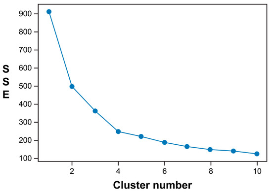 The calculated POI type embedding values were aggregated for each bike station, and k-means clustering analysis was then performed. Because k-means clustering is used to determine the center of the cluster to minimize the sum of squares error (SSE), the optimal value of Cluster k is determined by the elbow technique by checking the SSE. In the present experiments, the SSE was at the minimum value for k = 4, as shown in Figure 7.