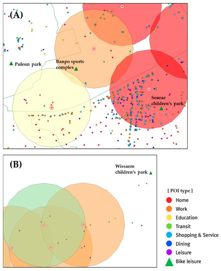 To verify the distribution of POIs in the significant clusters, the regions A and B in Figure 8 are magnified and shown in Figure 9. Because region A is dense with clusters 1, 2, and 3, features can be compared for each cluster. Cluster 1 (marked in red) is the center of work, transportation, and shopping, with various POIs concentrated along the road. Cluster 2 (marked in orange) contains relatively fewer POIs but is highly influenced by POIs related to bike leisure, such as parks and playgrounds. Bike leisure POIs are designed to have an influence range of 1000 m from the center of a bike station; thus, the POIs outside the buffer range are also in the ambit of this cluster. Consequently, not only the Banpo sports complex in Cluster 2 but also Puleun park and Seorae children’s park are in the ambit of Cluster 2. Cluster 3 (marked in yellow) is a residential area where residential POIs are identified at the bottom of the figure. Region B is located in the foothills of a mountain and thus contains relatively fewer POIs. Cluster 4 (marked in green) reflects greenfield characteristics, and Cluster 2 is influenced by the Wissaem children’s park outside the buffer range, similar to region A. This confirms that our POI-type embedding design is well customized for bike trips when configuring clusters.