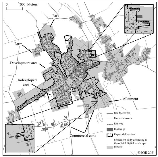 For this reason, geometries of settlement bodies (ATKIS®-Ortslage) from the nationally available Authoritative Topographic-Cartographic Information System (ATKIS® Base DLM) have been used to determine UGBs [,]. However, the geometry of the settlement bodies from a digital landscape model is suboptimal, namely a rough approximation of inner zones/UGBs. Figure 1 shows the key problem of the current data situation: the geometry of the settlement bodies (ATKIS®-Ortslage) includes many areas that do not belong to the UGB as determined by expert delineation (ED). These are, for example, allotments or large facilities for livestock breeding as well as agricultural land, green areas and parks. On the other hand, the ED (which is the most exact form of manually created UGB) is not available for the entire settlement, that is, parts towards the east and north are excluded. While the ED is only indicated for part of the settlement, the ATKIS®-Ortslage includes almost all built-up areas. Additionally, the highly detailed delineation of the ED can be clearly seen. The boundary is generally located directly behind buildings. The ED is very fine-grained and selective in terms of the inclusion and exclusion of certain buildings and areas.