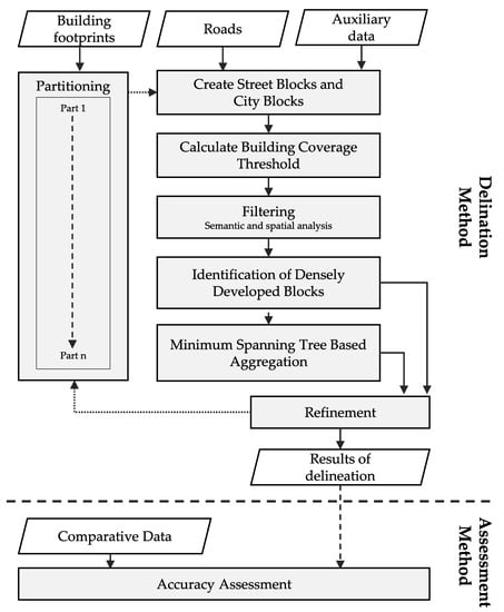Our approach presents a way of extracting settlement boundaries, in particular urban growth boundaries (UGBs). As inputs, the automated procedure uses commonly available topographical data, particularly building footprints, road networks or land use data. It is primarily adapted to the (legislative) situation in Germany. Before the method is described in detail in the following sections, Figure 2 provides a brief overview. Initially, the building footprint data are used to partition the study area. Before the buildings can be aggregated within these partitions, several initial processing steps are necessary. These include identifying the city and street blocks from the road network data and auxiliary data, calculating a building coverage threshold and filtering out buildings that do not meet the criteria for the UGB. Subsequently, the aggregation is carried out iteratively. After several refinement steps, the resulting geometries of the UGBs are saved and the next partition is calculated. Finally, the results are evaluated by comparison with expert delineations.