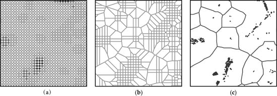 Cartographic partitioning process: (a) point raster with different density values represented by shades of grey from white = 0 to black = 1; (b) Voronoi diagram of selected points; and (c) original buildings (dark grey) and boundaries of the final cartographic partitions (light grey). Scale 1:100,000 (source: own illustration based on data from official building polygons, ATKIS®-Base-DLM © Geobasis-DE/BKG (2017)).