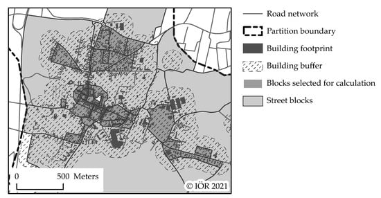 Our method uses the indicator building coverage ratio to help delineate city boundaries. This is the ratio of the summed area of building footprints to the area of a corresponding built-up area (m2/m2). It is a common indicator in studies in this field and is also known as the building footprint density [,]. Here street blocks are used as the spatial reference unit for calculating building coverage. As street blocks at the edge of settlements are very large (due to the transition into open space) and would thus distort the calculation of the threshold value, only blocks located in the centre of the settlement are considered. Initially, all buildings are buffered to a width of 100 m. Subsequently, overlapping buffers are dissolved and blocks that lie completely within each buffer area are selected. However, only blocks containing at least 20 buildings and building sections are selected for the calculation (Figure 4). Since there are also partitions for which no ratio can be calculated, due to their shape or because there are not enough buildings to form a settlement, a base value (global building coverage ratio) is determined at the beginning by applying the same procedure to the entire study area. Otherwise, the building coverage ratio is recalculated for each partition before each run (local building coverage ratio).