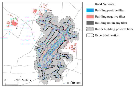 Not all buildings are relevant for determining the UGB. In order to identify the relevant buildings, a three-stage filtering is applied. In a first step, all buildings are identified whose function is usually not assigned to the UGB. According to § 35 of the German Federal Building Code (BauGB), building projects that serve certain functions are allowed outside a UGB. In most cases, these are functions that are undesirable within settlements, for example, sewage treatment plants, windmills or animal husbandry facilities. In addition, buildings are found outside the UGB, which, according to their function, do not contribute to the intended development of a settlement, such as allotments or weekend houses (cf. Table 1 and Figure 1). These building functions are added to a negative building filter (cf. Table 1). However, this negative building filter cannot be viewed as a reliable criterion because some uses occur both inside and outside the UGB (cf. Figure 5). For example, while barns and stables represent a typical use of buildings in outlying areas, in Europe they are also part of the typical townscape of rural settlements []. Therefore, a second filtering step is necessary to avoid deleting buildings that belong to the UGB. As residential buildings, commercial buildings and public buildings are mainly located within the UGB [] (see Table 1), this group of buildings (positive building filter) is used to create a sub-selection polygon. However, these buildings must have a certain level of significance to be considered part of a settlement []. All positive filter buildings are then converted into a point layer. Using the function described in Section 2.1, a density raster is generated from this layer, which is then converted into a point grid showing these density values. In the example, all points in this grid with a density value of less than 0.0003 were deleted, and the remainder buffered with a 50 m radius. The density value is determined empirically in such a way that individual residential buildings, or those at some distance to each other, do not contribute to the generation of the buffer polygons. Since a distance of 100 m was also chosen for the point grid here, the 50 m buffer forms an almost closed geometry. Finally, the previously described buildings that are allowed in the outlying area, and that are outside these buffer polygons, are deleted. Finally, small buildings and building annexes which are not relevant to the creation of an UGB are also omitted. For this purpose, objects are filtered using threshold values. In the case at hand, a threshold of 56.8 m2 was used for all detached buildings, and a threshold of 35 m2 for all non-detached buildings and annexes. The thresholds were determined empirically and are taken from [].