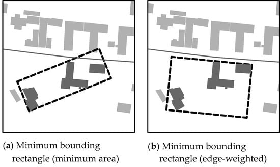 Based on the buildings in the remaining city blocks, a Delaunay triangulation is performed on the centroids of building polygons. The edges of the graph are weighted by the distance from building edge to building edge. Afterwards, the weighted graph is used to create a minimum spanning tree (MST). The Kruskal algorithm (part of python package networkX) is used to calculate the MST [,]. Subsequently, all edges of the graph are deleted, which are crossed by roads longer than 50 m. This creates smaller trees. Aggregation is done by grouping several buildings together using an edge-weighted minimum bounding rectangle (MBR) along the branches of the tree. The self-developed algorithm for the creation of MBR is described in Algorithm 1. The resulting rectangles are oriented along the dominant edges of the building group (cf. Figure 6b).