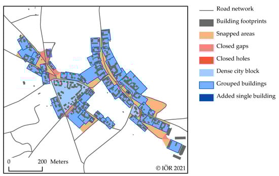 From an urban planning point of view, the city block is the smallest urban unit and an important reference point for spatial analyses []. We make use of two definitions of city blocks. Conzen [] describes a city block as parcel or as a group of adjacent parcels that are partially or completely surrounded by roads []. He calls these city blocks street blocks. In the following, we will use this term for polygon shapes derived from the road network data and the partition polygons. Only areas that are completely surrounded by roads, streets and the outline of the partition polygon can form a street block. Luft and Bender state that city blocks may also be part of a predominant built-up area enclosed by topographical lines, in particular by roads or paths []. In our model, railway lines, prominent vegetation (e.g., forest and bog) and water bodies are considered to be topographical elements. Topographical features such as geophysical obstacles, elevations or even slopes (dams, embankments, ditches, rivers and the like) and forest edges regularly form boundaries for an UGB [,]. In our study we call these more structured blocks city blocks. They are created by merging the outlines or polylines of the corresponding data with the outlines of the partition polygons. Afterwards, these polylines are converted into polygons as described above. In the respective data sets, all polygons that do not contain buildings are deleted.