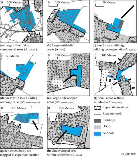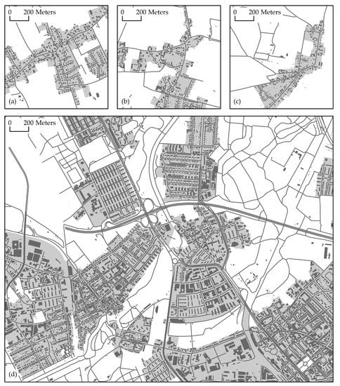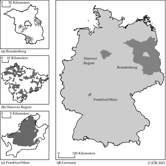 Similarly, the comparative data for the Hanover region was created manually in 2005 from an automated land survey map and orthophotos as part of the Regional Planning Programme to record all small settlements with fewer than 2000 inhabitants []. Therefore, the data cover only parts of the region.